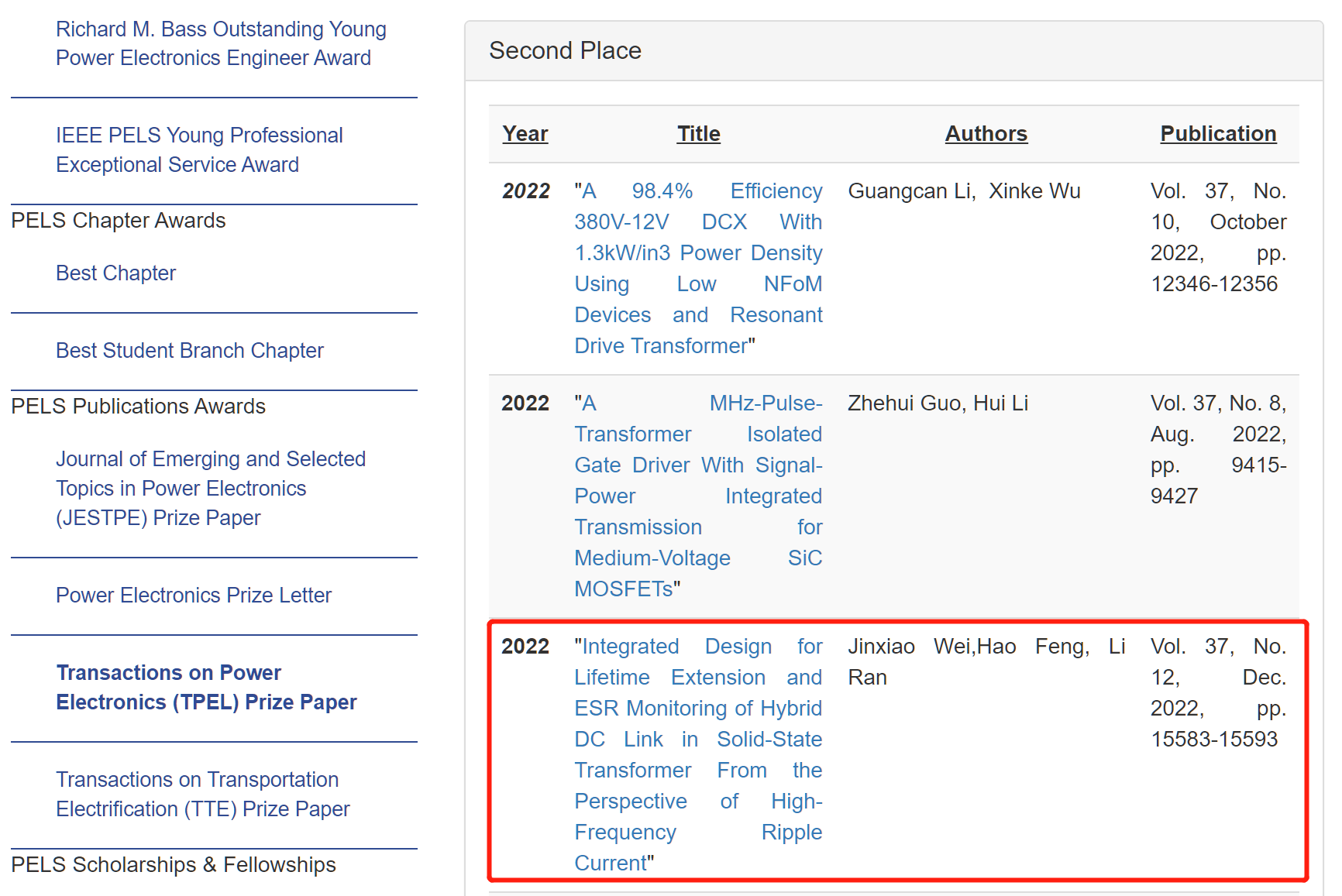 近日,IEEE电力电子学会(PELS)公布了旗舰期刊IEEE Transactions on Power Electronics (TPEL) 2022年度论文奖(Prize Paper Award)获奖名单。百家乐规则-百家乐补牌规则 电力电子与电力传动系博士生魏金萧、丰昊副教授(通讯作者)和冉立教授合作的论文《Integrated Design for Lifetime Extension and ESR Monitoring of Hybrid DC Link in Solid-State Transformer From the Perspective of High-Frequency Ripple Current》获得...