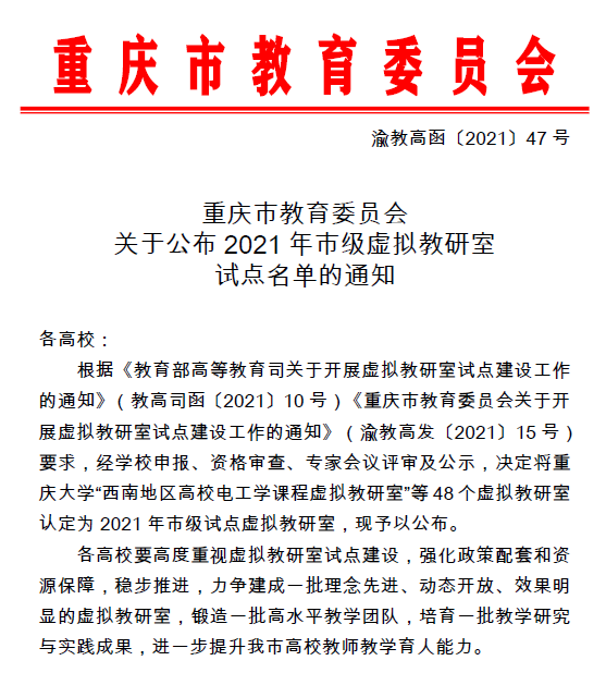 近日,重庆市教委公布了2021年市级虚拟教研室试点建设名单,我院侯世英教授牵头申请的“西南地区高校电工学课程虚拟教研室”项目获批立项。虚拟教研室是“智能+”时代的新型基层教学组织,目的是推动教育教学资源共建共享,促进高等教育高质量发展。重庆市教委于今年7月组织开展了首批虚拟教研室的申报立项工作,经学校推荐、专家评审及公示,遴选了48个符合高校实际、具有明显特色的虚拟教研室建设路径和运行模式。拟通过3-5年...