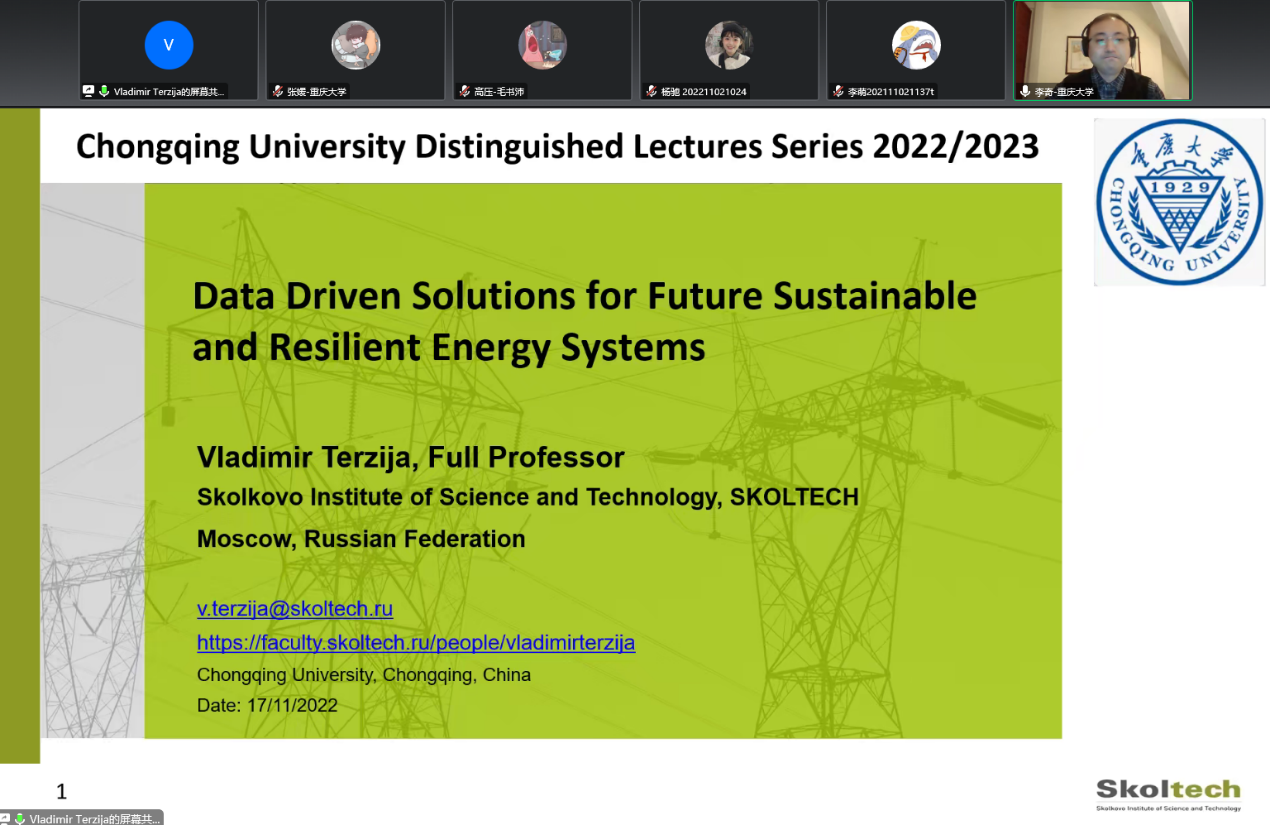 2022年11月17日下午,俄罗斯Skolkovo科学技术研究院教授、洪堡学者、IEEE会士Vladimir Terzija做客成渝地区双城经济圈智慧能源大讲坛第十四期暨智慧能源云讲堂第三十期,以“Data Driven Solutions for Future Sustainable and Resilient Energy Systems”为主题开讲。本期讲坛由重庆大学、输配电装备及系统安全与新技术国家重点实验室和重庆大学溧阳智慧城市研究院主办,由成都地区的四川大学、电子科技大学、西南交通大学、成...