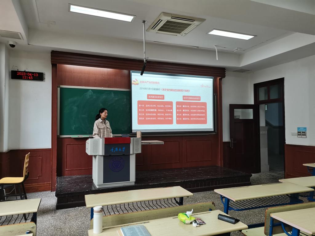 赵婷同志首先向大家介绍了全面从严治党方针的提出,以及全面从严治党的重大意义。赵婷同志介绍了《关于党内政治生活的若干准则》《中国共产党廉洁自律准则》的基本内容。全面从严治党是党的十八大以来党中央作出的重大战略部署,是“四个全面”战略布局的重要组成部分。党的二十大报告中也强调反腐斗争、正风肃纪工作的持续性和重要性,全面从严治党是党永葆生机活力、走好新的赶考之路的必由之路。