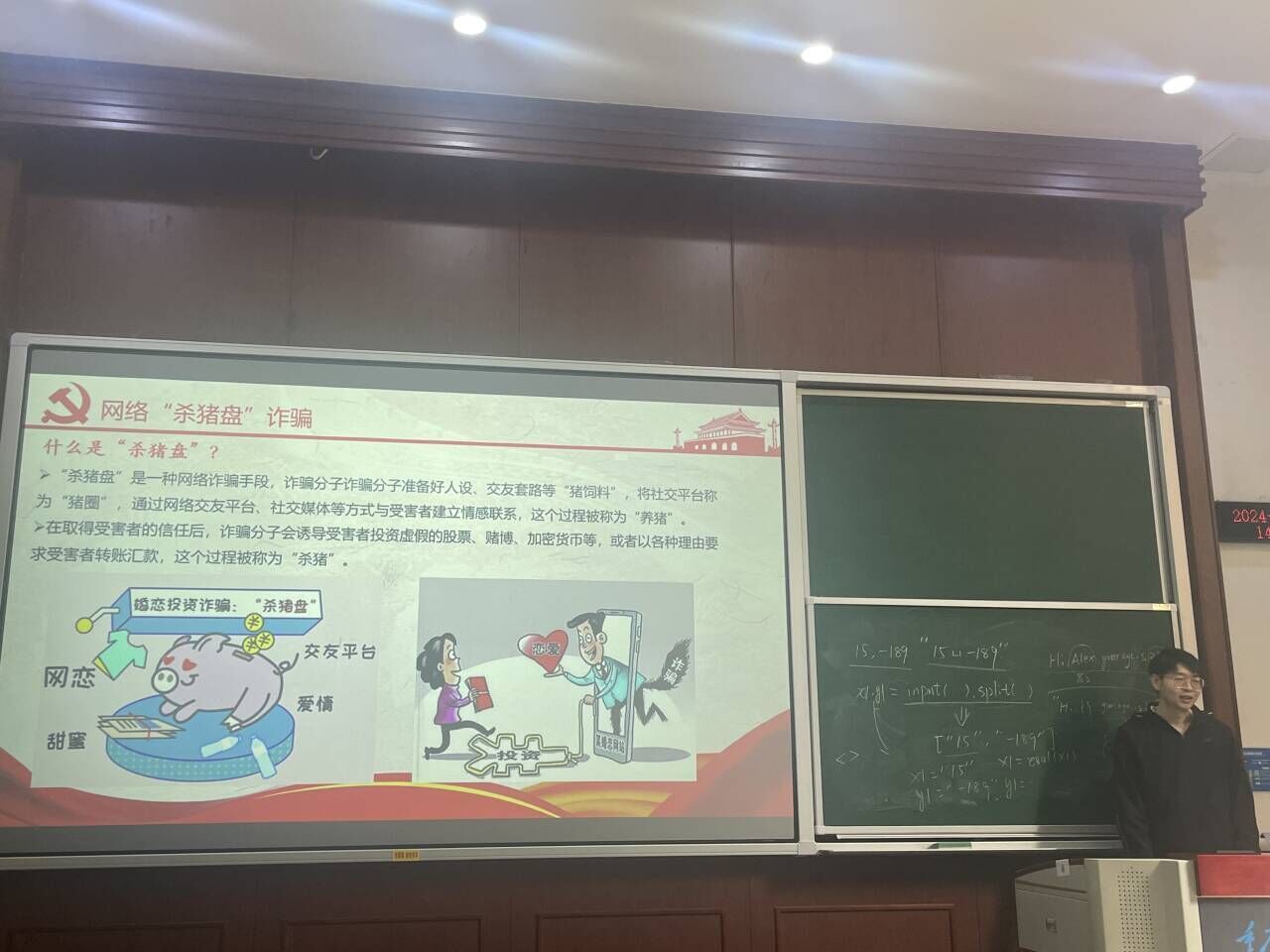 随着科技创新发展,网络攻击、网络窃密、网络诈骗频频出现,网络安全的风险正在被技术不断放大。高玉娇同志为大家讲述了网络安全的重要性,这关系国家、社会和个人,只有实现网络安全,才能正常的工作、生活、学习和消费。接着,韩威同志针对常见的网络威胁,如恶意软件、网络钓鱼、社会工程、内部威胁等,为大家介绍了防范网络安全威胁的办法,要定期检测、筛查系统和软件,并提高警惕和防范意识。韩威同志结合生动形象的案例,介绍了“杀猪盘”等网络诈骗行为,希望大家引以为戒、小心防范;接着也通过一段国家网络安全周宣传短片,让大家进一步了解了骗子的套路、学习到了反诈技巧,严防窃密诈骗,筑牢网络安全防火墙。