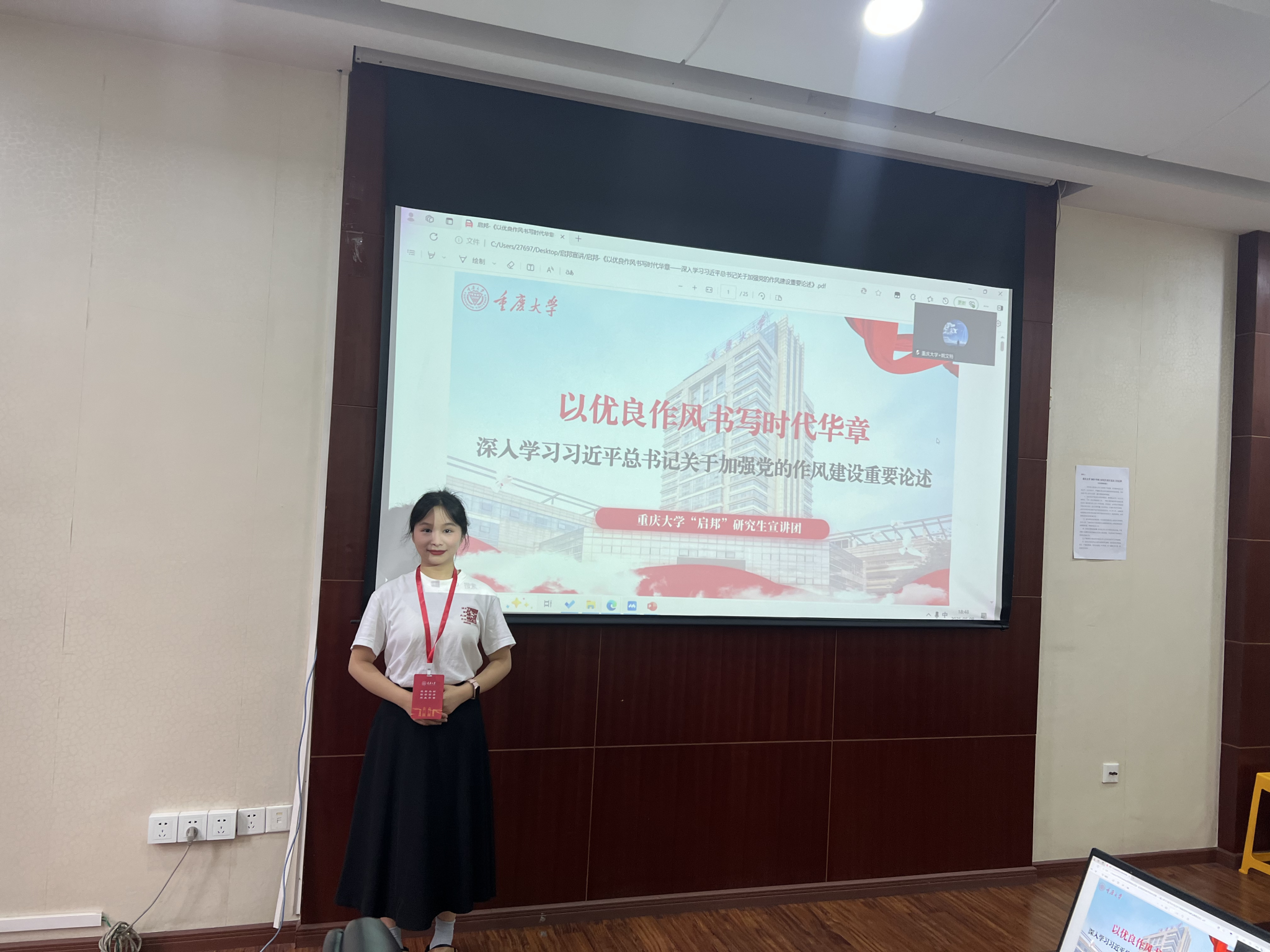 电力系统及其自动化硕士生二支部特别邀请了重庆大学“启邦”研究生宣讲团讲师郭伶俐,为支部全体党员讲授“以优良作风书写时代华章——深入学习习近平总书记关于加强党的作风建设重要论述”专题党课。