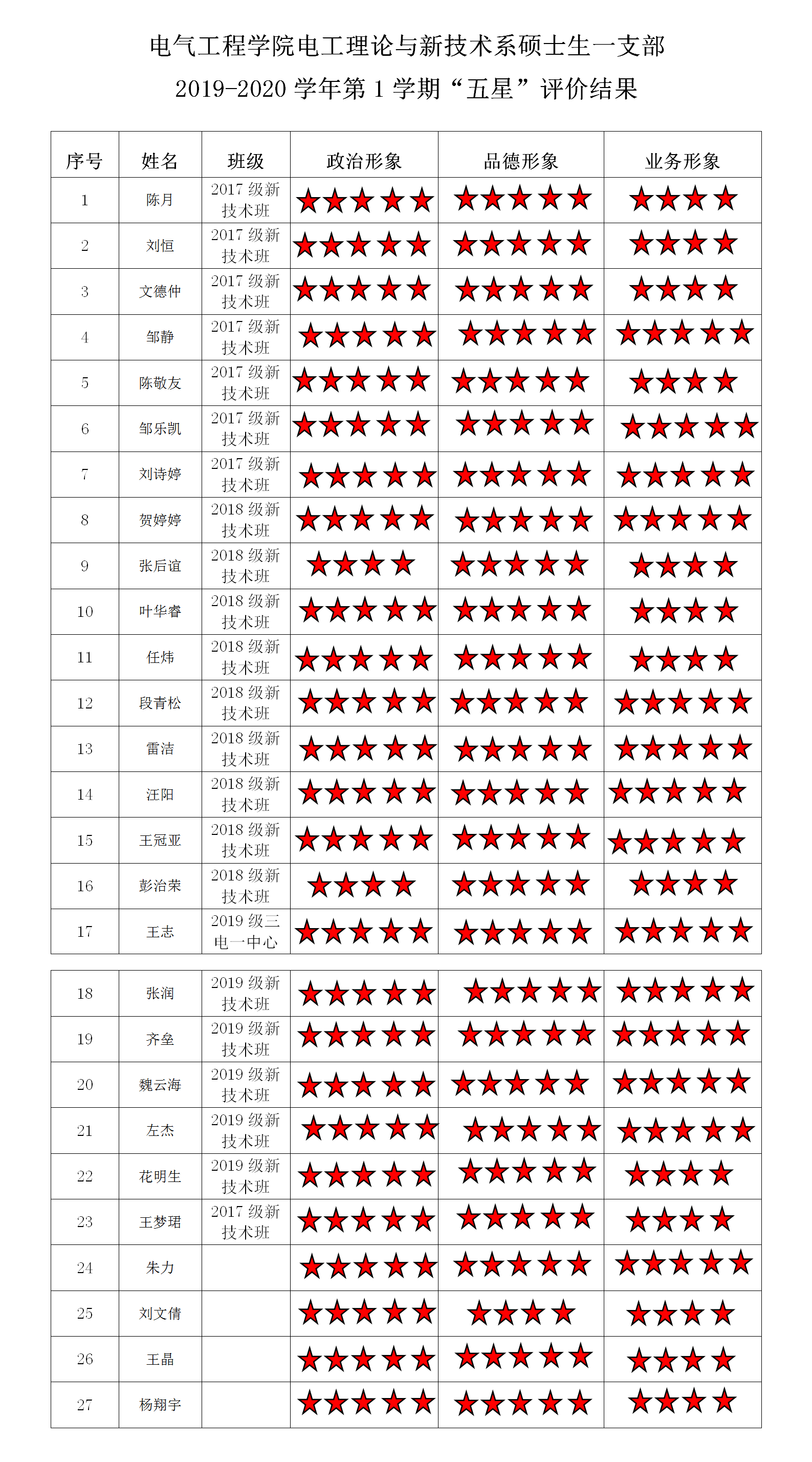 百家乐规则 电机与电器系硕士支部 2019-2020学年第1学期“五星”评价结果