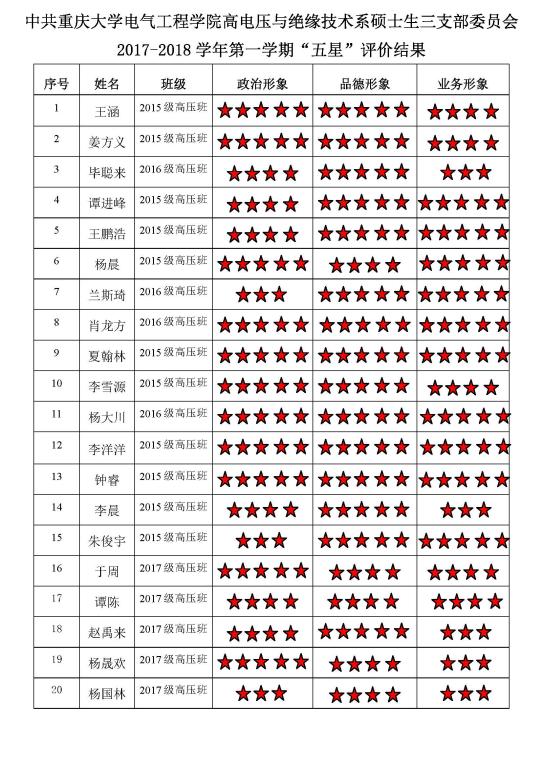 中共百家乐规则-百家乐补牌规则 高电压与绝缘技术系硕士生三支部委员会 2017-2018学年第一学期“五星”评价结果