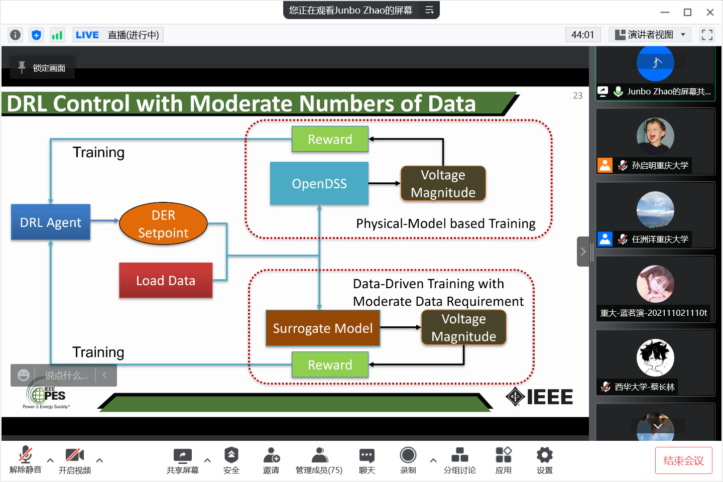 助理教授赵俊博受邀做客“成渝地区双城经济圈智慧能源大讲坛”,担任第十期主讲嘉宾,以“Physics-Informed Deep Reinforcement Learning for Power System Optimization and Control”为主题开讲。本期讲坛由重庆大学、输配电装备及系统安全与新技术国家重点实验室和重庆大学溧阳智慧城市研究院主办,由成都地区的四川大学、电子科技大学、西南交通大学、成都理工大学、成都中医药大学、四川师范大学、西华大学、西南科技大学和重庆地区的西南大学、重庆邮电大学、重庆科技百家乐规则