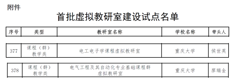 2022年2月21日,教育部办公厅公布了首批虚拟教研室建设试点名单,重庆大学共有6个项目入选,其中我院廖瑞金教授牵头的“电气工程及其自动化专业基础课程群虚拟教研室”、侯世英教授牵头的“电工电子学课程虚拟教研室”项目获批立项。