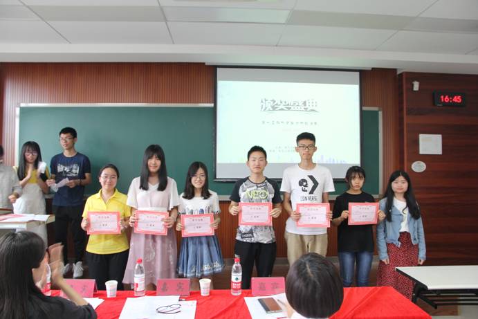 比赛的最后,由三位辅导员老师分别为获奖同学进行颁奖,之后罗敏老师对对本次比赛的开展进行了肯定,也提出了不足之处。她指出希望通过比赛能使同学们认识到自己知识的欠缺之处,不仅要学好课本上的知识,还要注重拓展课外的知识面。本次“科创杯”知识能力竞赛在最后的合影留念中圆满结束。