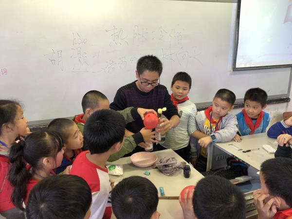 的9名志愿者,在电气青协指导中心四名干事李轲、李依笑、郭殊航和郑钦仁的带领下分别前往璧山保家小学和大路小学开展科技支教活动。此次是本学期的第三节科技支教课程,志愿者们特地为孩子们准备了“水往高处爬”、“神奇巫师的特饮”、“熄灭的蜡烛”“会吸气球的杯子”等趣味小实验,并用PPT进行了丰富细致的讲解。孩子们在动手的欢乐中,学习到了毛细作用、二氧化碳的阻燃作用、热胀冷缩等知识。
