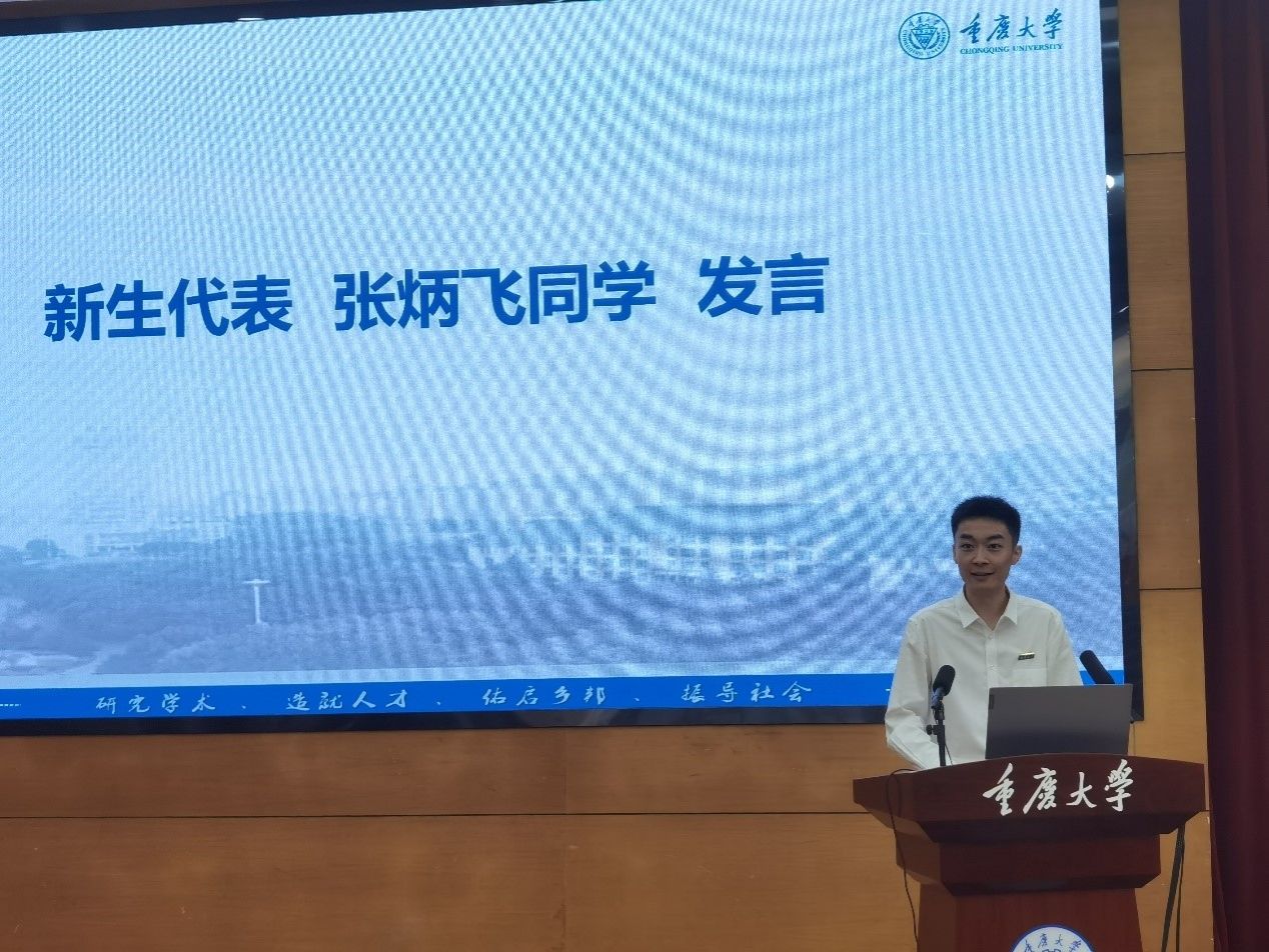 新生代表张炳飞跟同学们分享了自己在重庆大学求学及支教期间的所见所想所感,鼓励同学们珍惜来之不易的学习机会,艰苦奋斗,开拓进取,勇担天下之责。