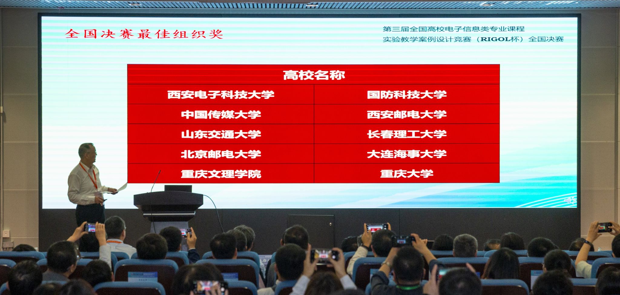 全国高校电子信息类专业课程实验教学案例设计竞赛(RIGOL杯)已被纳入中国高等教育学会“全国高校教师教学竞赛状态数据”,是目前电子信息类专业课程教学竞赛中唯一以实验教学为主题的全国赛事。本届比赛从全国北部、西部、中南部、东部4个赛区共425支队伍参赛队伍中遴选出218支队伍,经过实验教学案例设计展示、参赛教师答辩、专家评审,共评出一等奖44项,二等奖67项,三等奖97项。