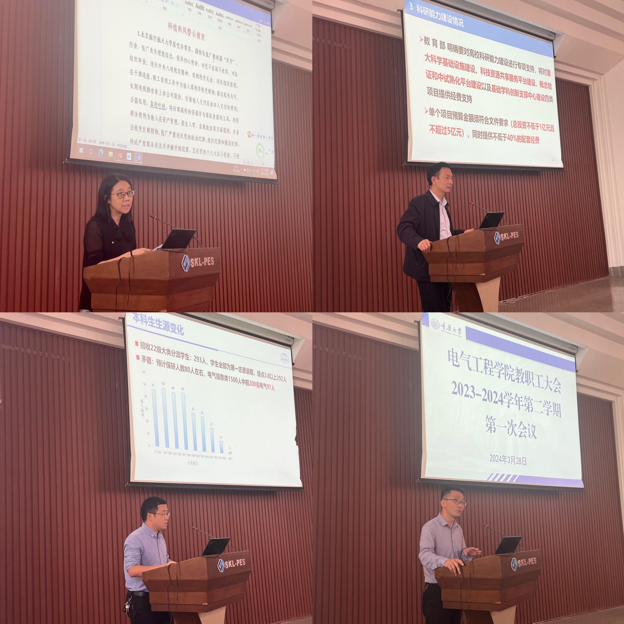 2023年绩效总体发放原则和具体发放情况;杜雄就2024年国家和重庆市自然科学基金申报情况、科研能力建设、学科建设经费分配初步方案等进行了简要通报。杨鸣从本科教学规范、研究生过程管理等方面再次强调了教学纪律、培养要求和导师职责的重要性。曾礼强简要通报了百家乐规则