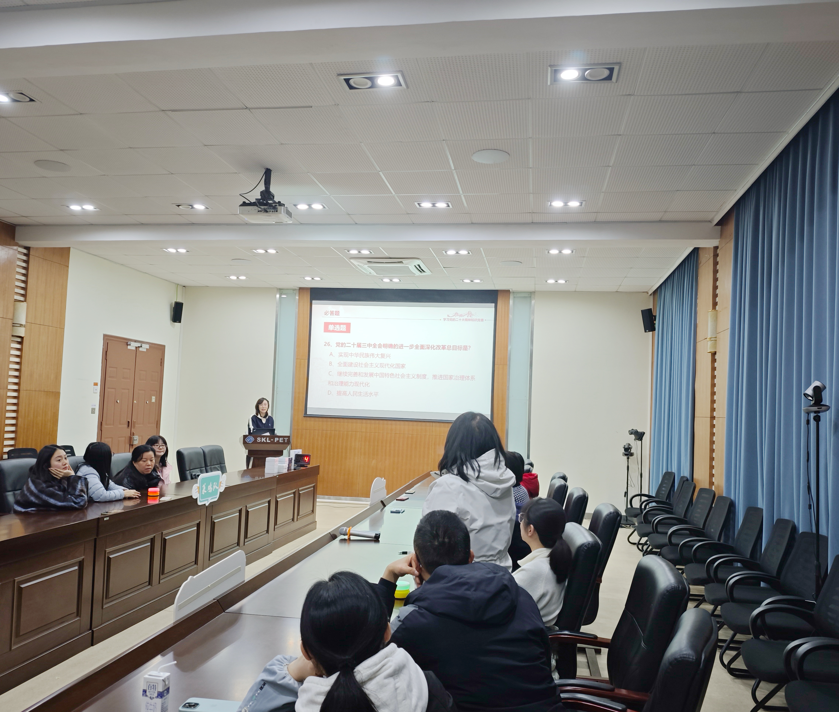 本次知识竞赛题目涵盖了党的二十届三中全会精神、全国教育大会精神、《中国共产党章程》《中国共产党纪律处分条例》等内容,设置个人题、团队题等抢答趣味环节,参赛者们分成“菜鸡队”“卫冕先锋队”“做题都队”“对对队”4组同台竞技,主要采取现场抢答、积分排序的方式进行。活动现场既有紧张激烈的竞赛氛围,又有团队协作的温暖瞬间,每一位参与者都沉浸其中,乐在其中。通过激烈角逐,参赛队伍展现出了扎实的理论功底,不仅检验了学习成果,更激发了学习热情,形成了以学习促实践的良好氛围。最后由“菜鸡队”获得一等奖,“卫冕先锋队”获得二等奖,“做题都队”获得三等奖,“对对队”获得参与奖,刘陶老师获得最佳答题奖。