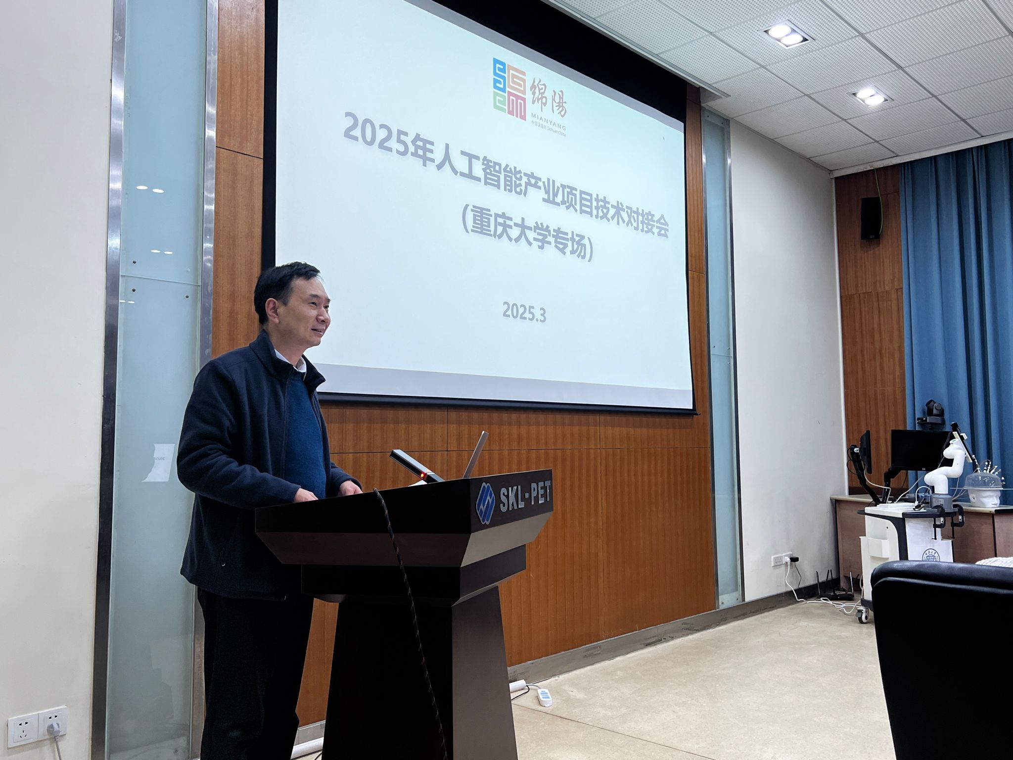 杜雄对绵阳市各单位的到来表示热烈欢迎,并回顾了重庆大学在推动产学研融合方面的成果。他指出,重庆大学始终以服务国家重大战略需求为导向,致力于构建跨学科协同创新平台,希望通过此次对接会深化校企合作,加速核心技术攻关与成果转化,为人工智能产业发展注入新动能。