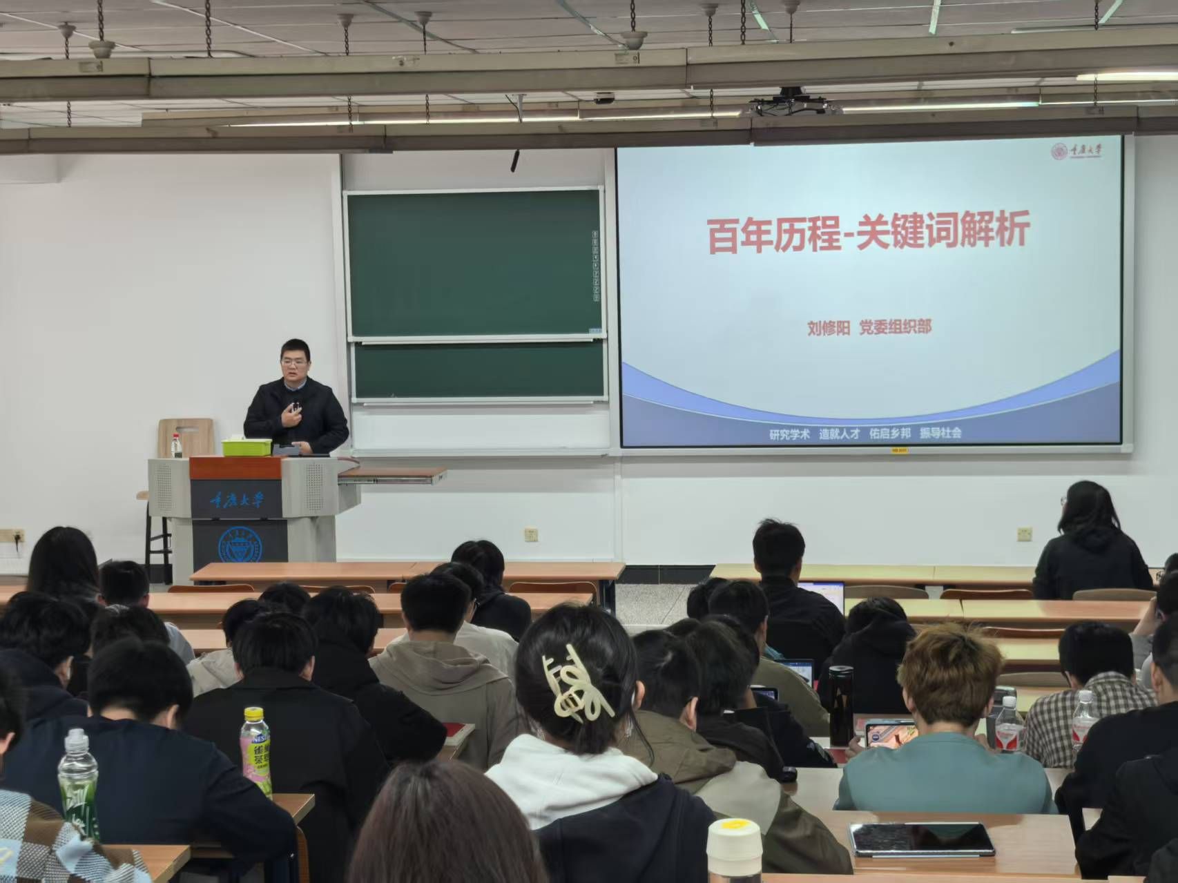 4月3日晚,校党委组织部组织工作室主任刘修阳同志为学员们讲授“中国共产党百年历程--关键词解析”主题党课,课程通过关键词解析、历史影像与地方红色资源结合等方式,系统回顾党的百年奋斗历程,并设置互动环节深化学习效果。他引用习近平总书记“认真学习党章、严格遵守党章,是加强党的建设的一项基础性经常性工作,也是全党同志的应尽义务和庄严责任”的论述,勉励学员们,作为入党申请人,要深入学习、深刻领会,在思想和行动上与党中央保持高度一致。