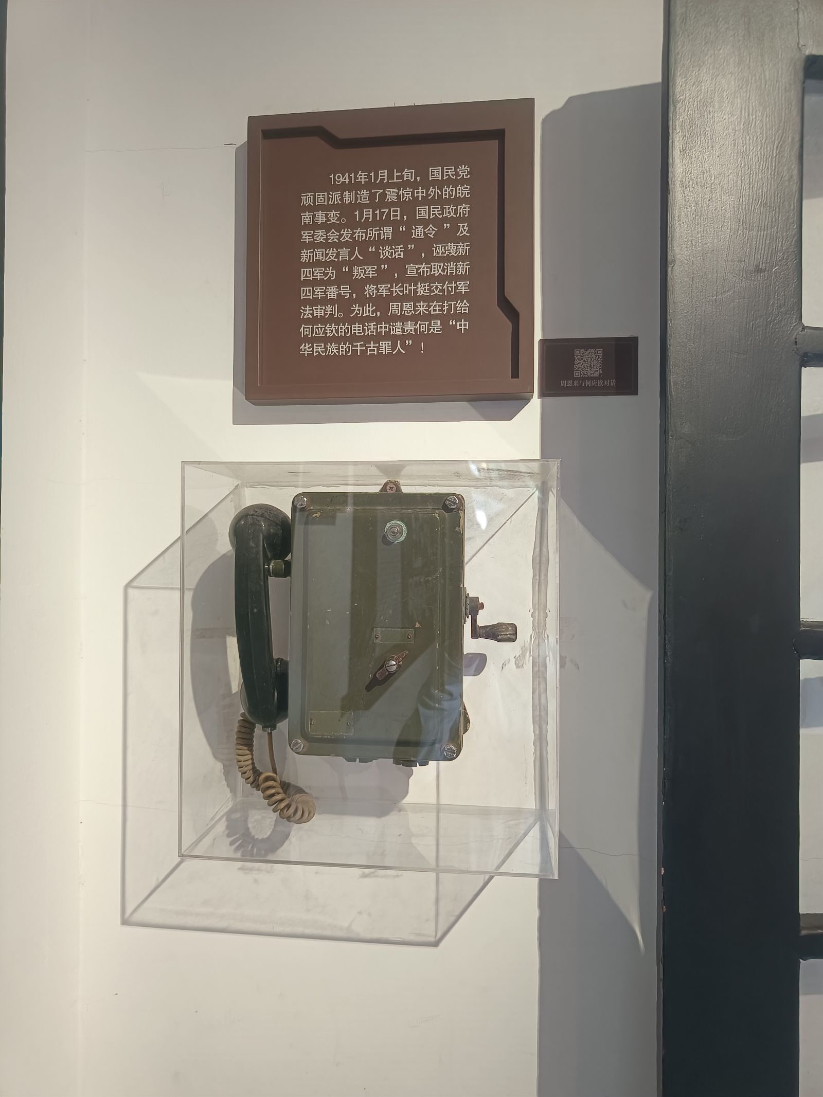 在一楼大厅的墙壁上,有一部老式电话。1941年1月上旬,国民党顽固派制造了震惊中外的皖南事变。1941年1月17日,周恩来为皖南事变向国民党谈判代表张冲提出质问和抗议,并打电话怒斥何应钦。这通电话就是在这里拨出去的。