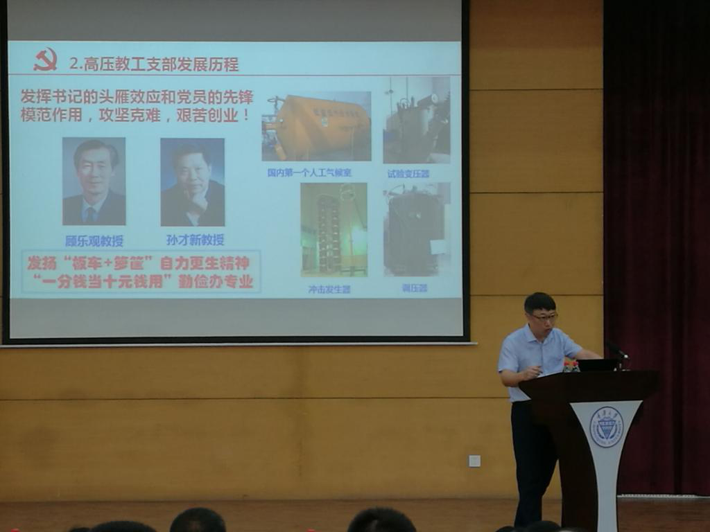 2019年4月25日下午,高电压与绝缘技术系教工党支部书记姚陈果老师在重庆大学党建“双创”工作经验交流推进会上发言,向全校教工党支部书记介绍高电压与绝缘技术系教工党支部全国党建工作样板支部建设情况。