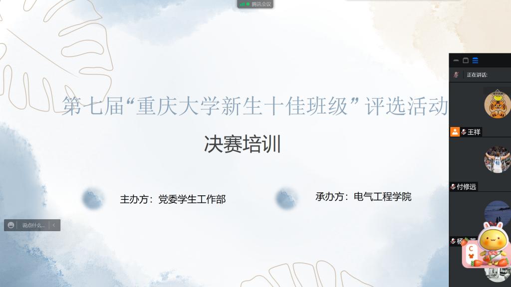 为开展好第七届“重庆大学新生十佳班级”评选活动,提升参赛班级的战斗力和表现力,促进班级团结向上、积极进取,以更优秀的班级风貌迎接决赛的到来,2022年5月22日10:00,第七届“重庆大学新生十佳班级”评选活动决赛培训在腾讯会议举办。本次培训邀请到党委学生工作部付修远老师和材料科学与工程百家乐规则 任超老师,两位老师有着丰富的大赛组织和指导经验,对班级建设的理解新颖独到,富有指导意义。付修远老师对本次进入决赛...